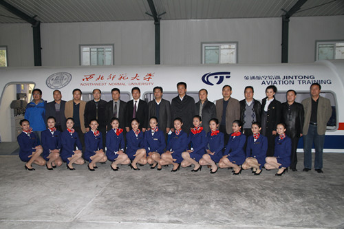 11月5日,西北师范大学音乐表演专业(空中乘务方向)民航模拟舱实训教室落成交接仪式在模拟舱实训教室举行。北京广慧金通教育科技有限公司董事长焦殿成、副总经理付晓军,西北师范大学副校长董晨钟,学院党委书记贾志斌、院长把多勋,学校办公室、教务处、财务处、基建处、国有资产管理处、招生考试中心等部门负责人和学院部分师生参加了交接仪式并观看了空乘专业学生的安全演示。