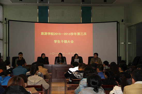 11月17日,院团委在学院7楼导游情景模拟实验室召开本学期第三次学生大会,团委书记王瑞、专职辅导员韩若苑、兼职辅导员张杰,张景瑞出席大会,学院大一、大二、大三全体学生干部参加大会,会议由学生会主席杨紫晨主持。