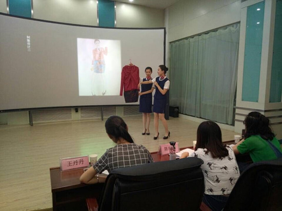 比赛由PPT讲解,创意解读,实物展示等环节组成。各乘务组根据设计创意,借助PPT展示对精心设计的制服进行了解读。评委老师进行精彩细致的点评,针对不同的制服提出了修改意见,强调制服一定要在舒适,便于工作的基础上,体现航空公司的精神和设计者的理念。本次制服设计中既有帅气的裤装,又有柔美的裙装,绚丽缤纷的色彩,赋有创新的设计,新颖超前的理念,配上同学们生动活泼、幽默风趣的走秀,赢得了全场的阵阵喝彩声。