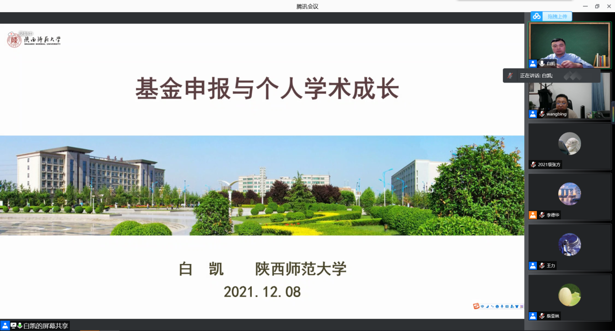 2021年12月8日晚,应学院邀请,陕西师范大学地理科学与雷竞技ray官网教授、博士生导师白凯教授为雷竞技官网师生作了题为“基金申报与个人学术成长”的学术报告,报告会由院长梁旺兵教授主持。