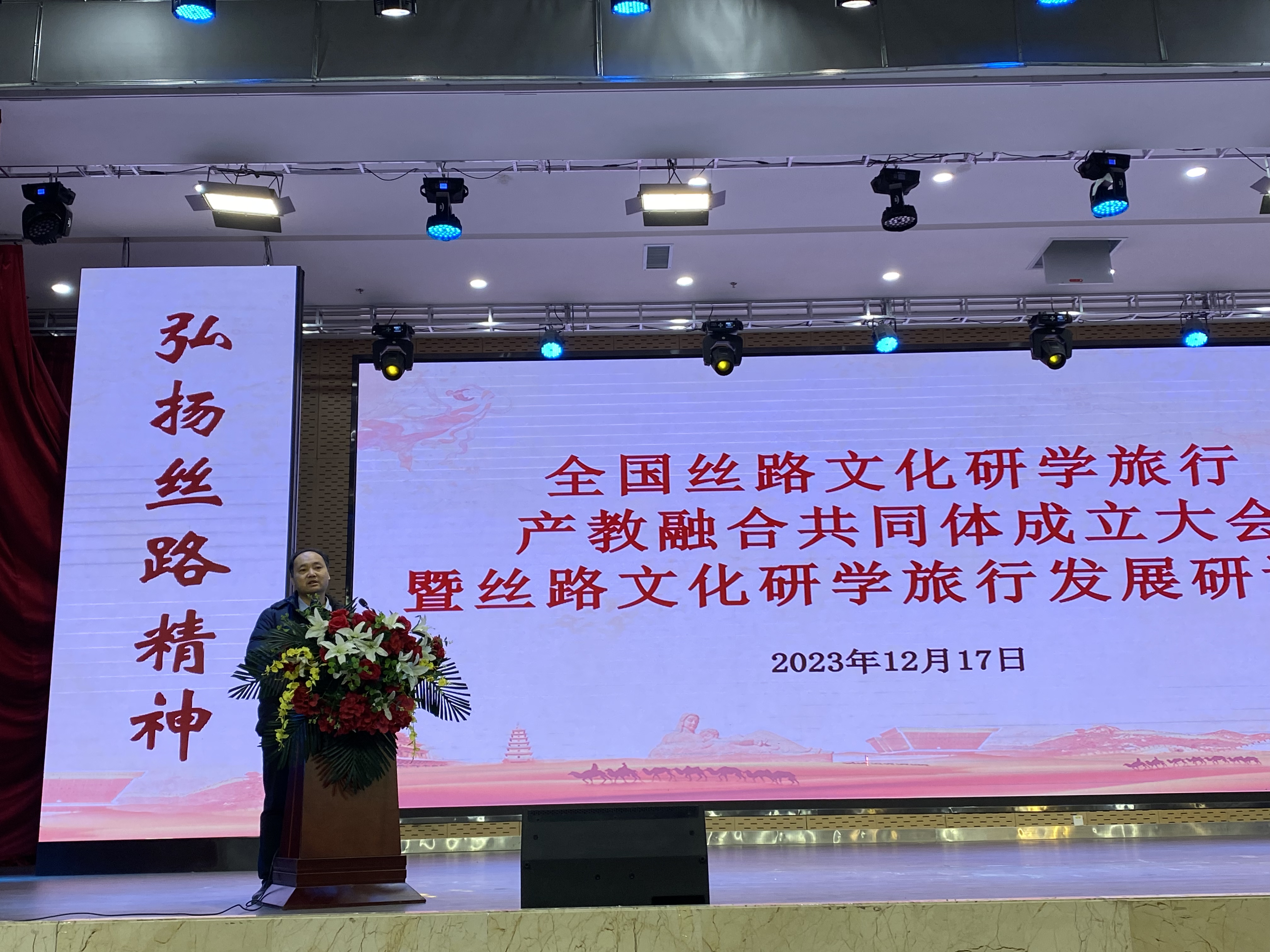 2023年12月17日,学校党委常委、纪委书记、监察专员马庆同志带领雷竞技ray官网梁旺兵院长、王力副院长和武克军副院长一行参加了全国丝路文化研学旅行产教融合共同体成立大会。