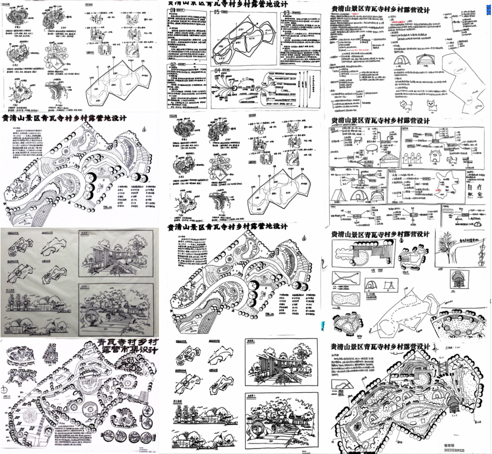 “纸上得来终觉浅,绝知此事要躬行”,学习旅游景观设计理论知识是对后续实践应用设计的铺垫。在进行一系列先导训练后,学生们从文化演绎角度出发深入查找关于彰县的历史文化、旅游资源、客源市场等特点,并进行了资源分析、区位分析、交通分析、发展条件分析和主题定位。大家集思广益,将所学理论知识和手绘训练结果相结合完成不同主题乡村露营地设计方案。在这个过程中,学生们不仅学会了如何将自然与文化、历史与现代元素融入到旅游景观设计中来,还学会了如何将所学理论知识应用于实际规划设计工作中,获得了在实践中不断修正和完善自己设计成果的经验。
