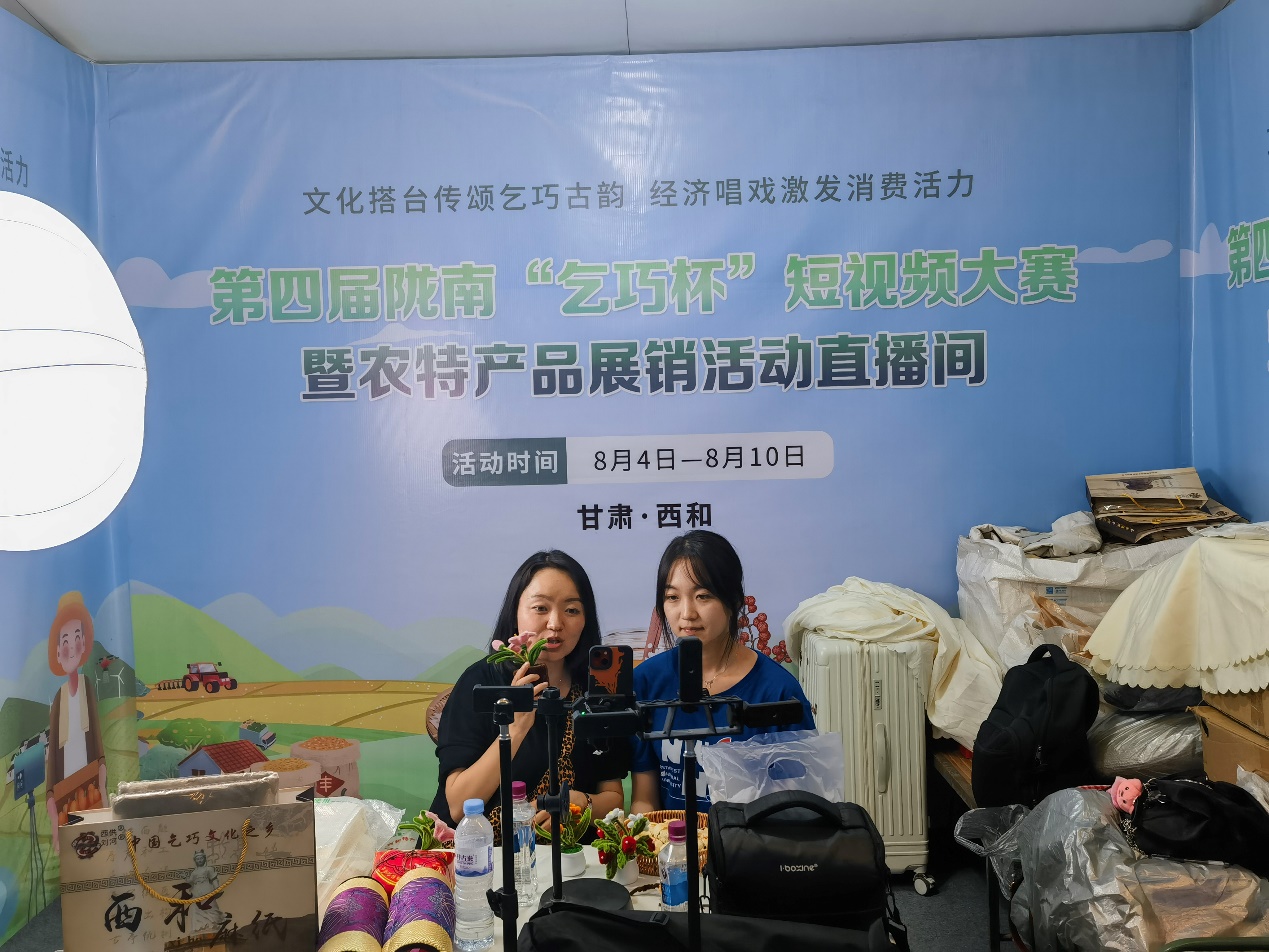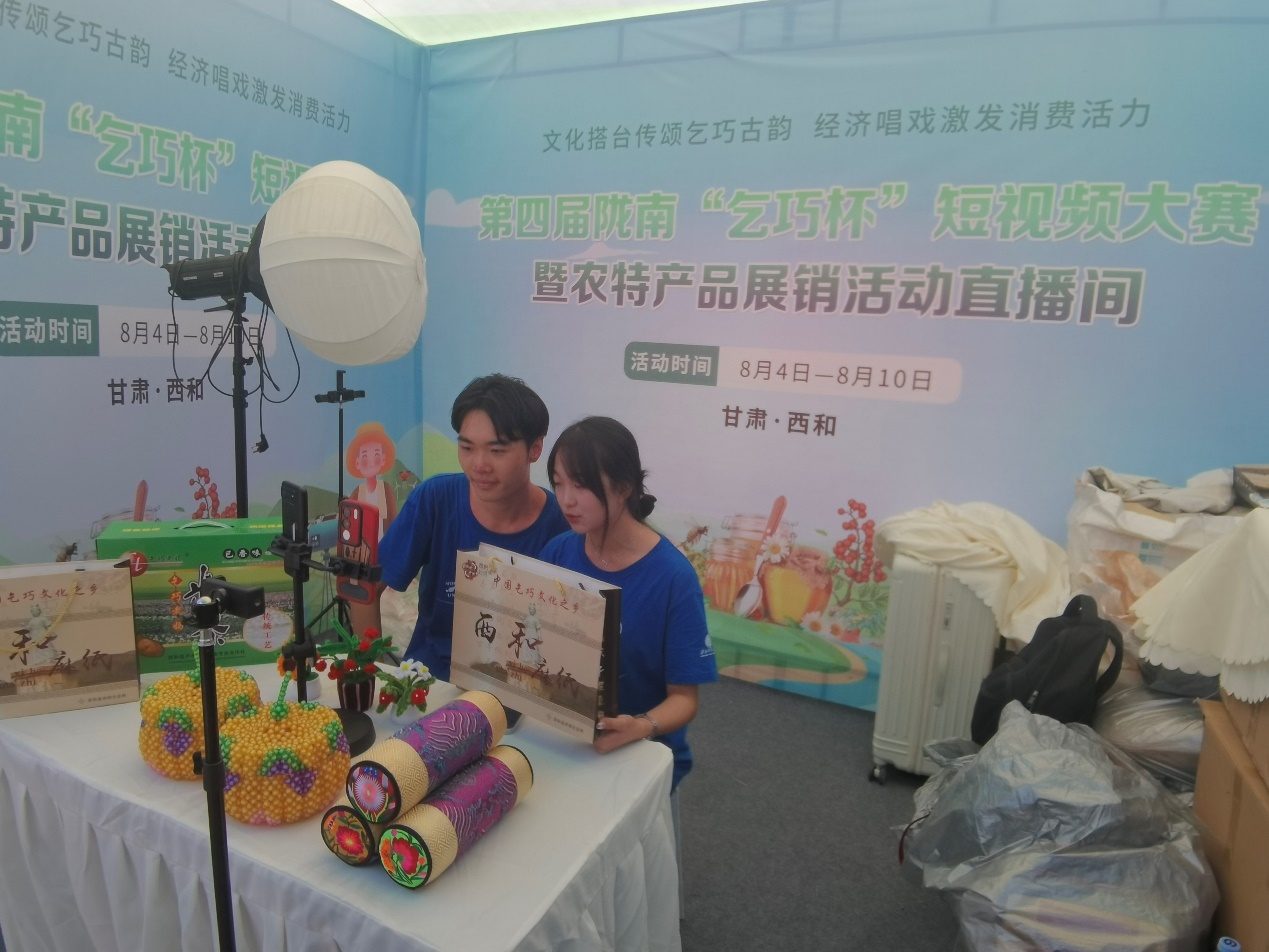 8月5日“数字经济·电商赋能”农特产品展销暨“乞巧杯”短视频大赛在西和县避难广场开展。实践团指导教师鲁梦鸽带领团队成员要积极顺应时代发展趋势,利用互联网直播平台方式,从而更加高效的助力当地农特产品进行展销。队员们开设自媒体账号,充分利用短视频直播机制,分别展开活动现场主会场、分会场直播,为当地农户、残疾人、小型农产品生产商等商家协助直播带货,用自己的实际行动真正做到了知行合一,进一步推动了乡村振兴。