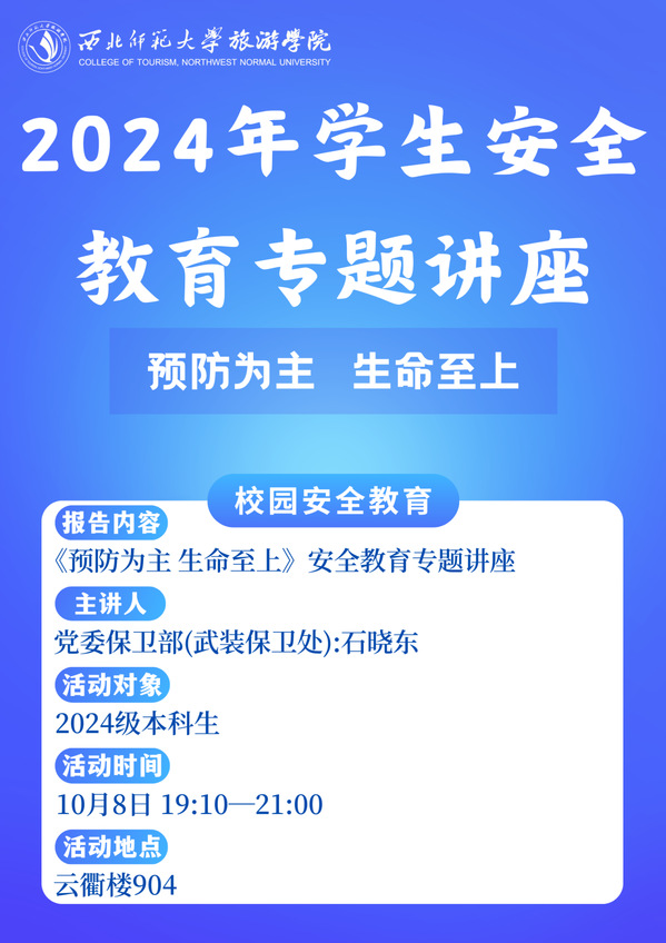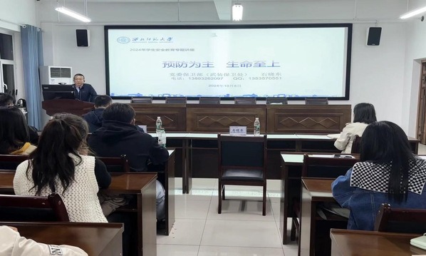 10月8日晚,雷竞技ray官网邀请党委保卫部(武装保卫处)石晓东老师在云衢楼904报告厅为师生作题为《预防为主 生命至上》的安全教育专题讲座。雷竞技ray官网党委副书记戴小武老师、雷竞技ray官网团委书记鲁梦鸽老师、2024级旅游管理专业、文化产业管理专业、航空服务艺术与管理专业本科生共计130余人现场聆听讲座。会议由雷竞技ray官网研究生助管孔杰主持。