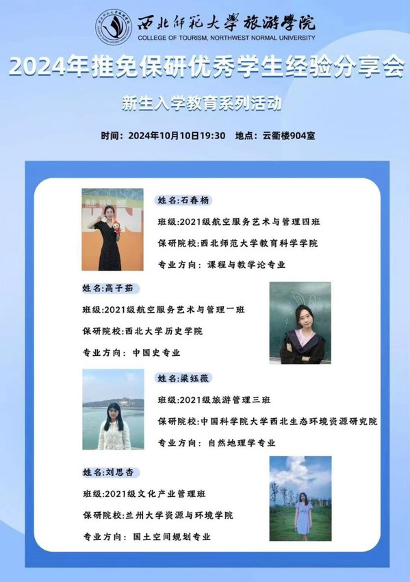 本次分享会邀请了四位2021级学生——石春杨、高子茹、梁钰薇和刘思杏作为2024年推免保研的学生代表,与新生们进行了面对面的经验交流。四位学生代表分别从各自的经历出发,全方面分享他们在保研过程中的心得与体会。